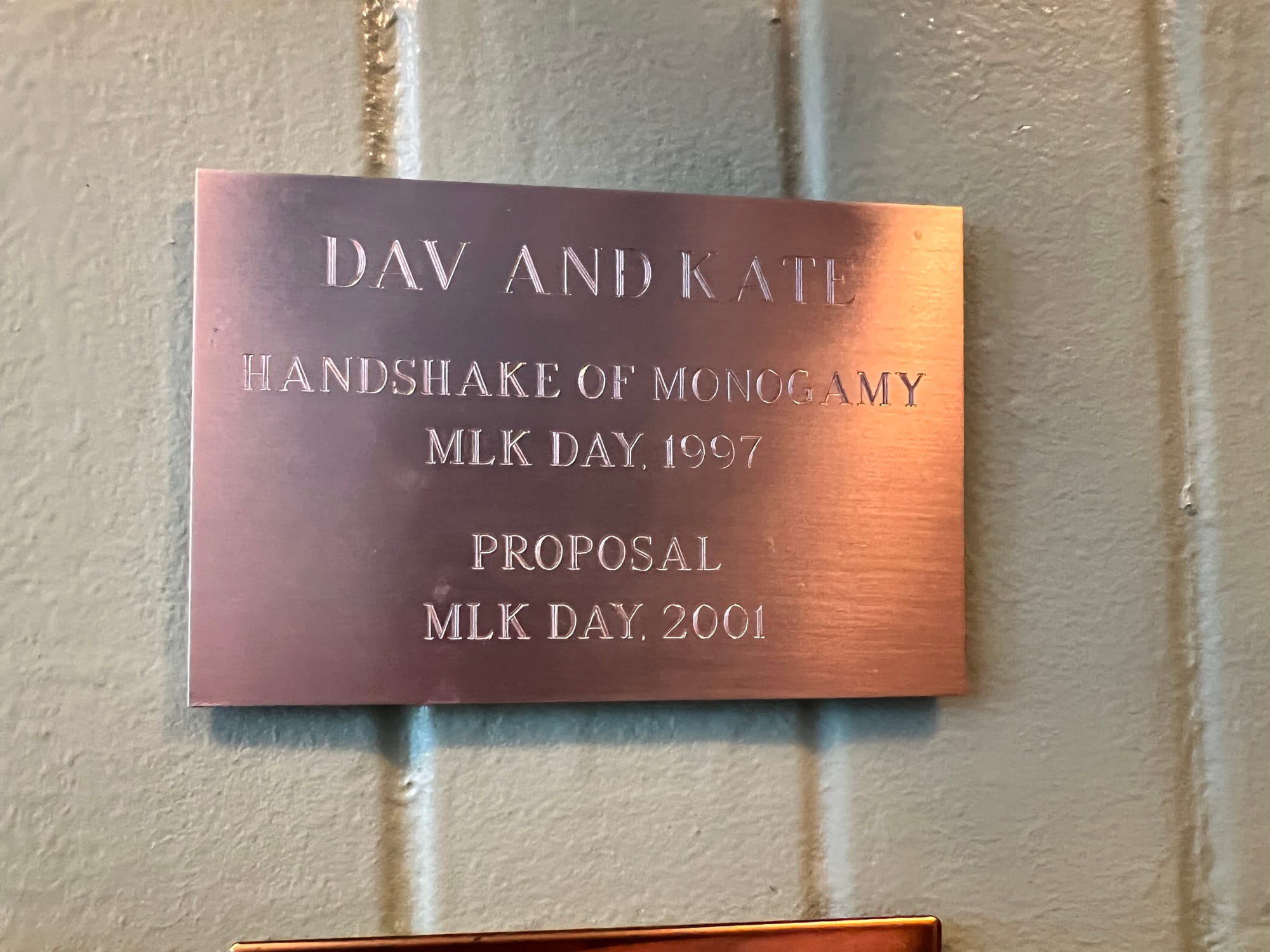 Earlier this year, I dined at Cafe Jacqueline, a phenomenal French restaurant in San Francisco’s North Beach. My friend and I happened to be seated at what was clearly the “proposal table,” because several plaques were erected at eye-level to commemorate the various couples who got engaged there, presumably after one of them spooned out a discreetly hidden ring from a dessert soufflé. Cute! But what stuck in my craw was one very interesting plaque dedicated to Dav and Kate, a couple whose “handshake of monogamy” occurred on Martin Luther King, Jr. Day, 1997. (Underneath, it notes that there was a proposal on Martin Luther King, Jr. Day, 2001.) What was going on there? Why MLK Day? Famously, Cafe Jacqueline’s staff are very difficult to get on the phone, so I never found out. Dav and Kate, please reach out! — Soleil