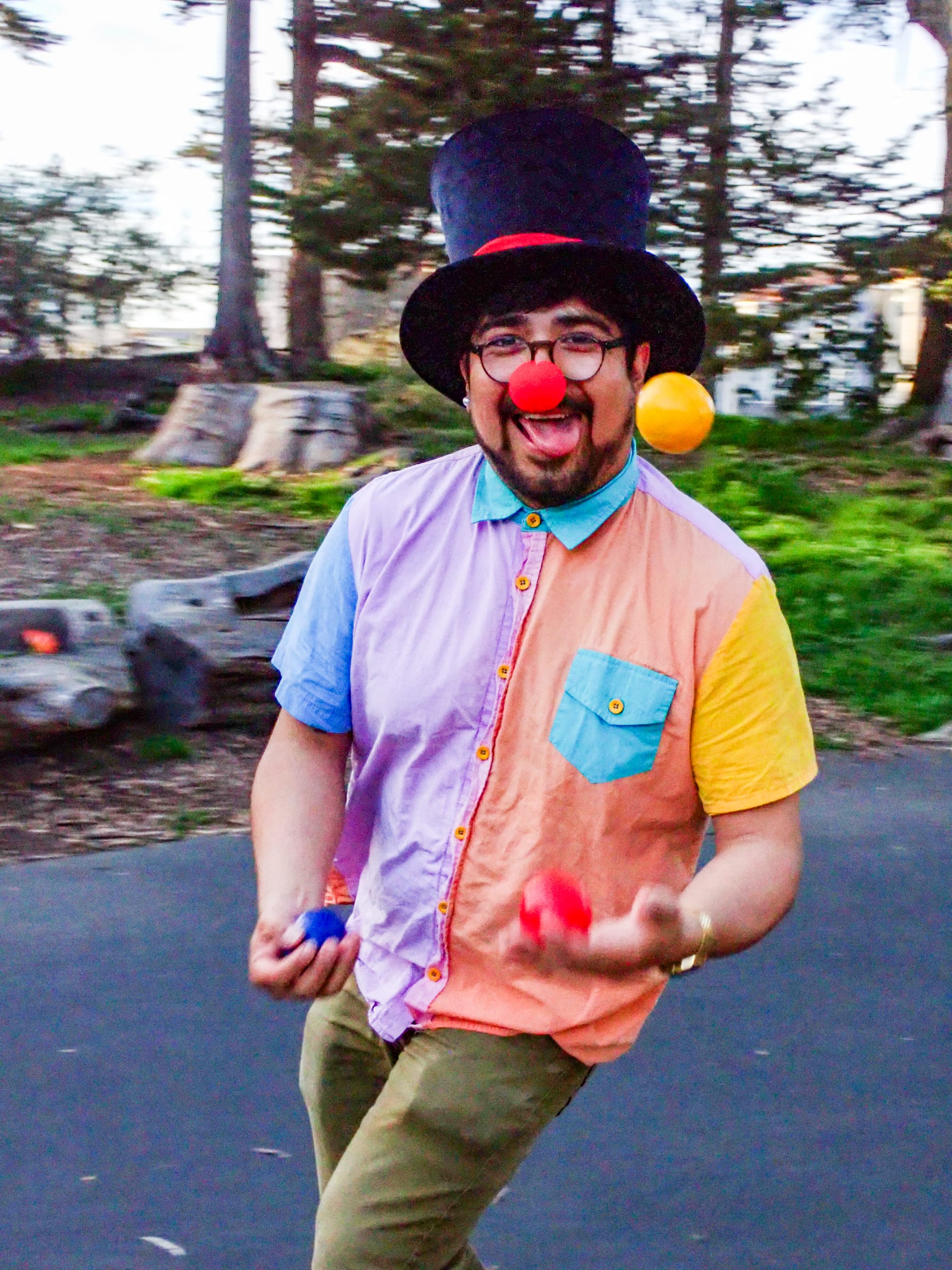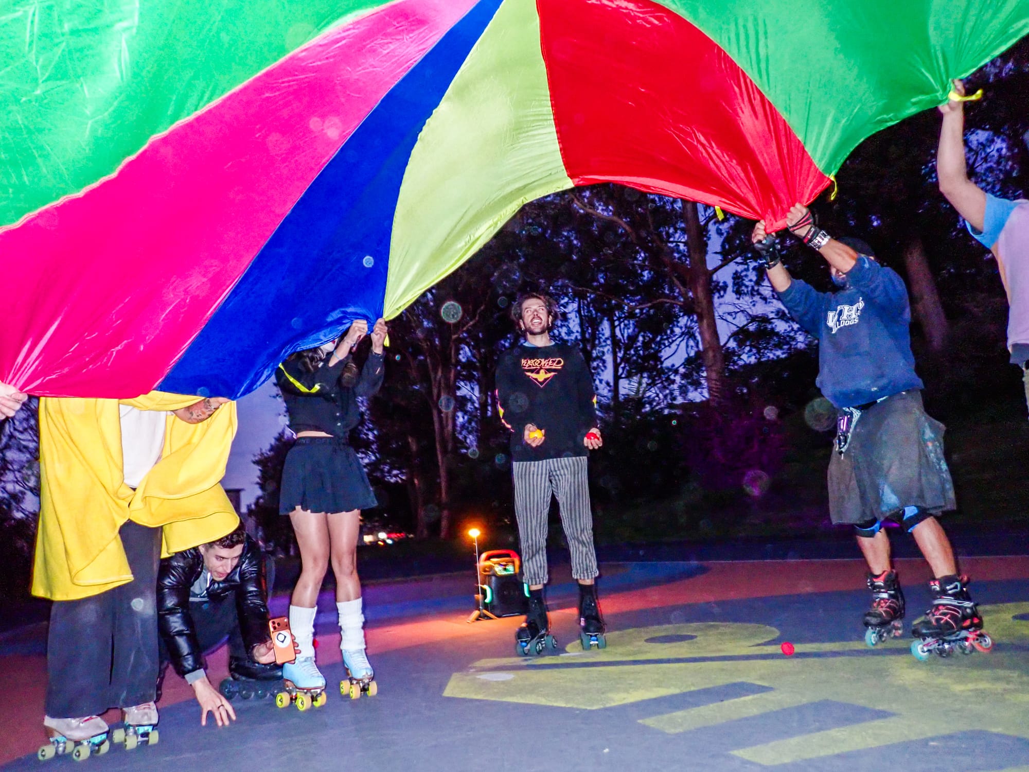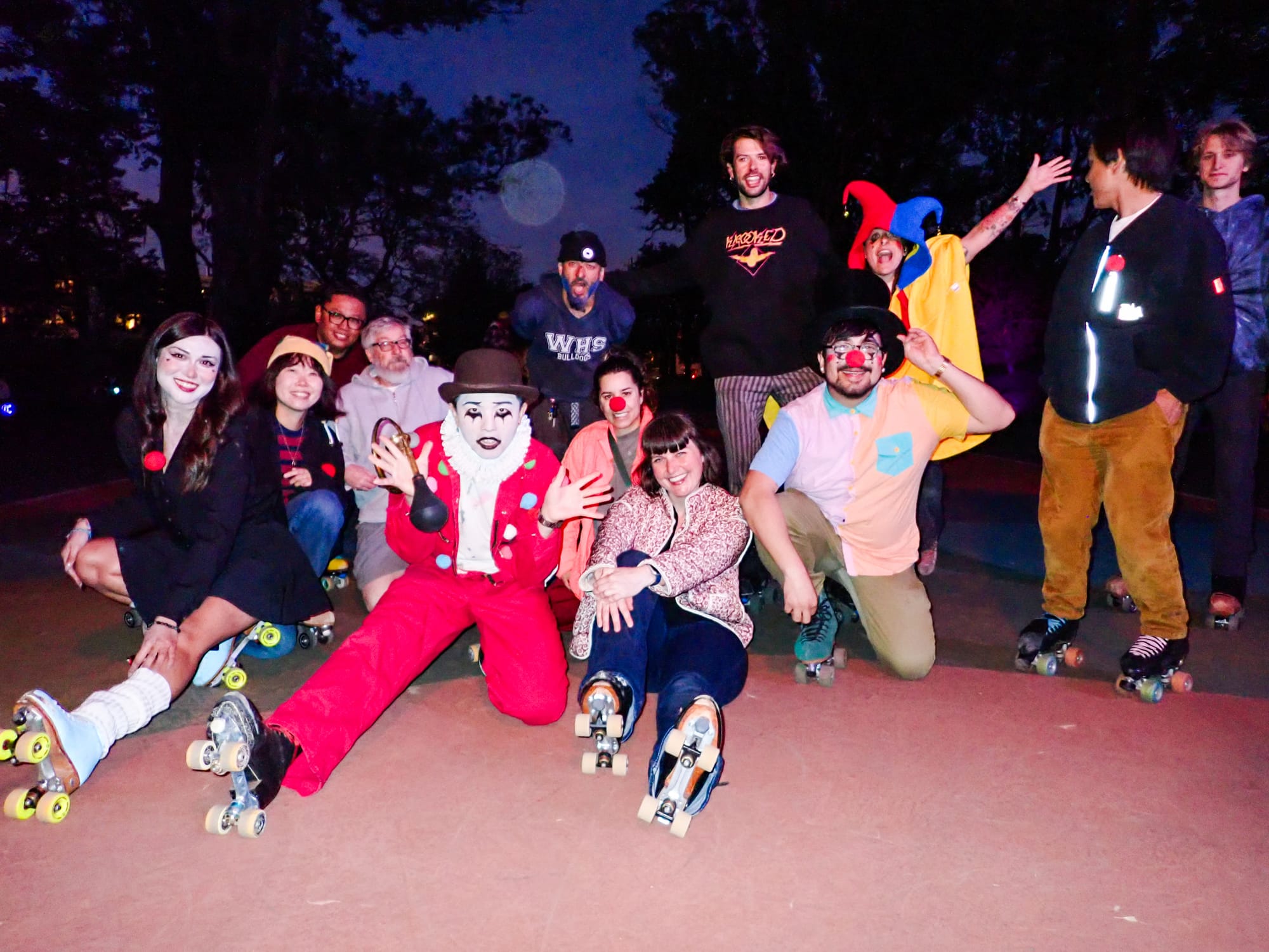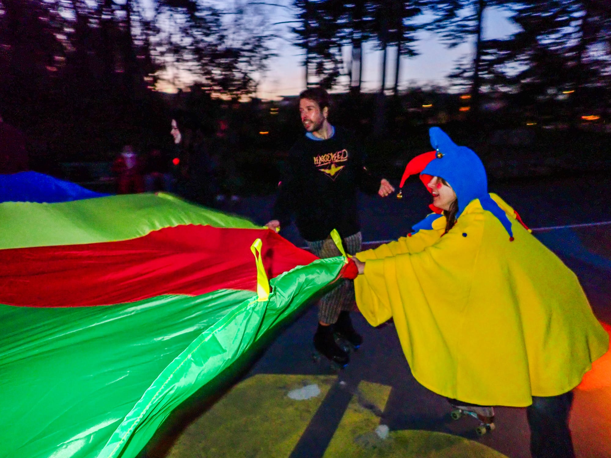 One skater, who just happened to be there amid the group of about 15 clowns, admittedly had “no idea what's going on,” but quickly joined in on the fun. Channeling Charlie Chaplin, we did a partner skate race, spun round n’ round a colorful parachute (yes like the one we played with as kids), then quickly proceeded to hotbox it inside (because we’re grown ups, actually).