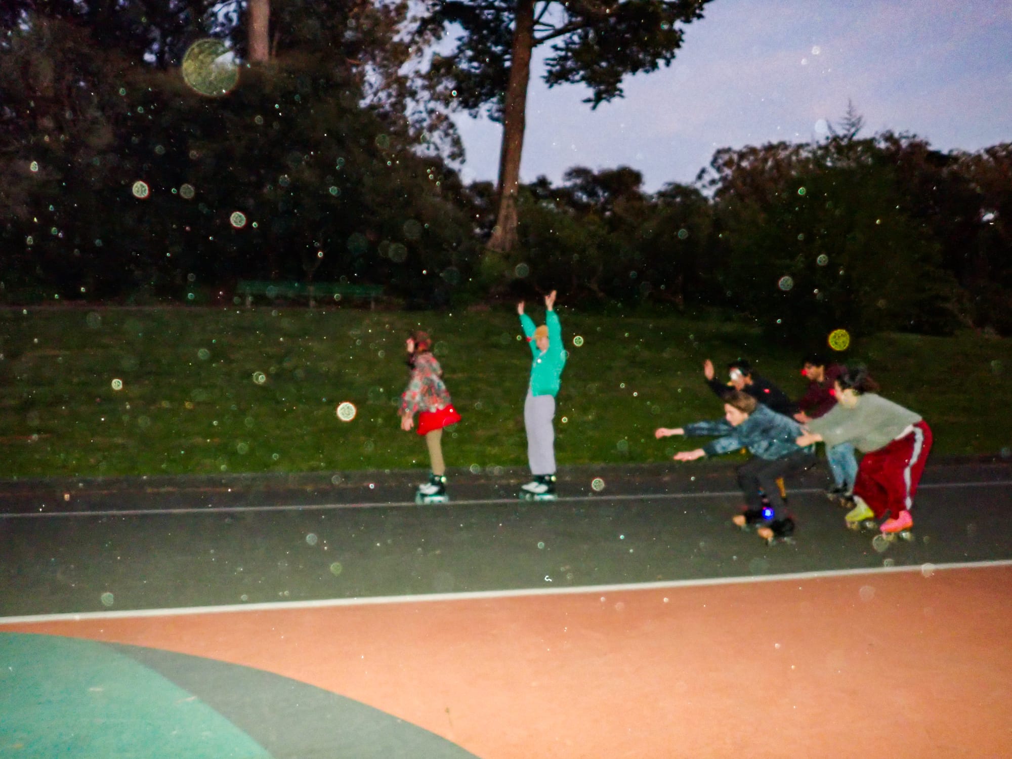 The night was alive thanks to AllSkate SF, a community-driven rollerskating group who meet up every Tuesday eve (weather permitting). It started in 2020 and is going strong today. People come from as far as Marin and Oakland to glide across the outdoor rink in sync with one other and the music. Each meetup has a theme or primary skill share, then a jam session. Sometimes karaoke tops it off.