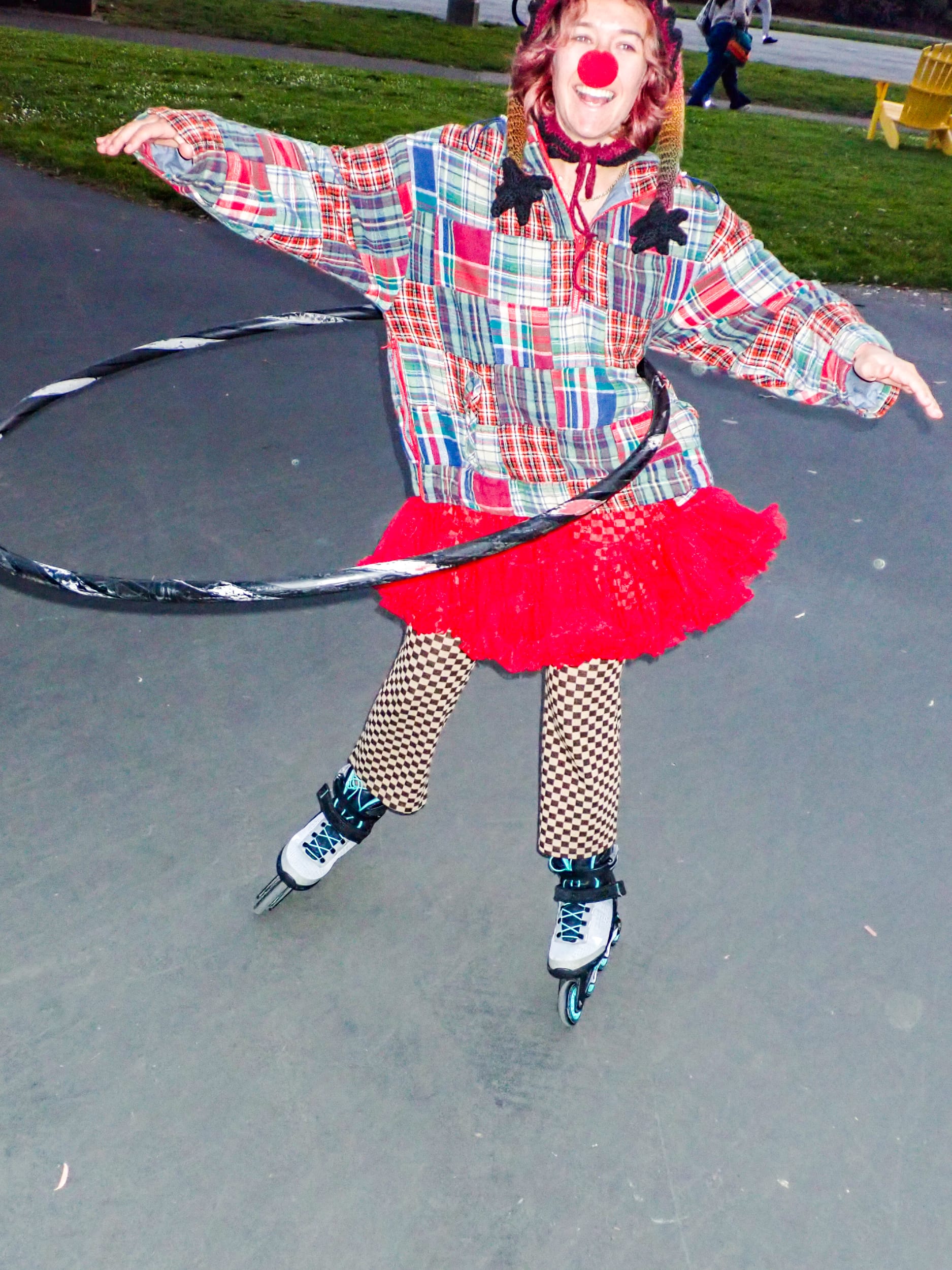 Once our feet were wheel-clad and everyone’s faces sufficiently clownified, we went around sharing our names, our theoretical clown names, what makes us feel joyful during these hard times.