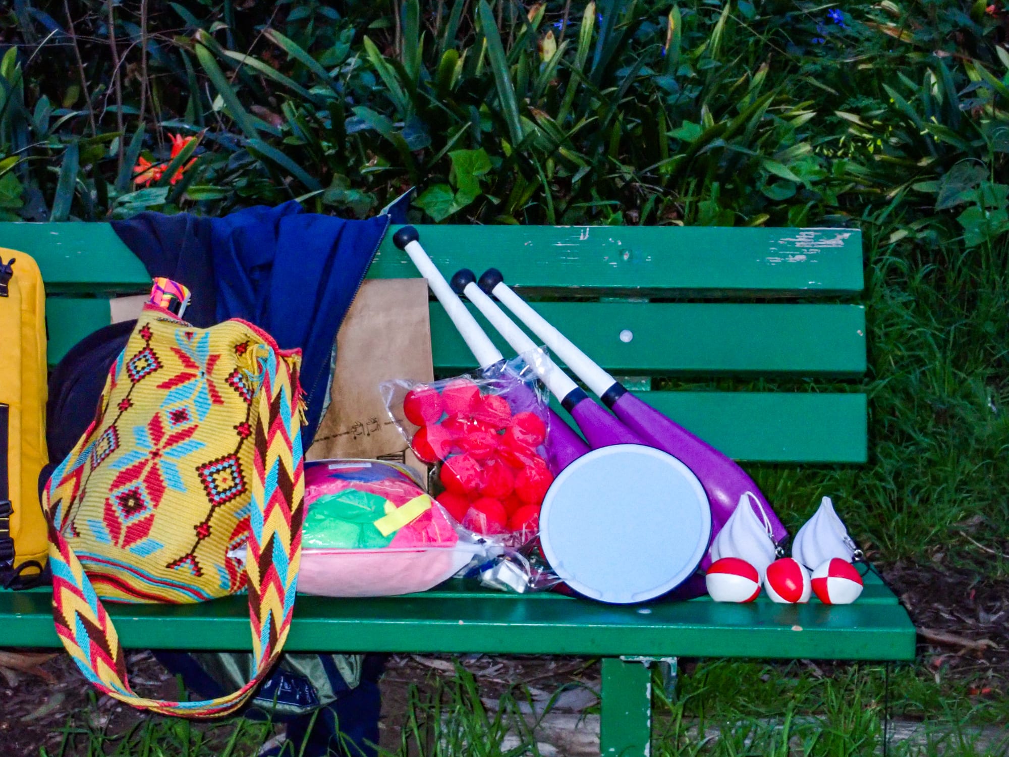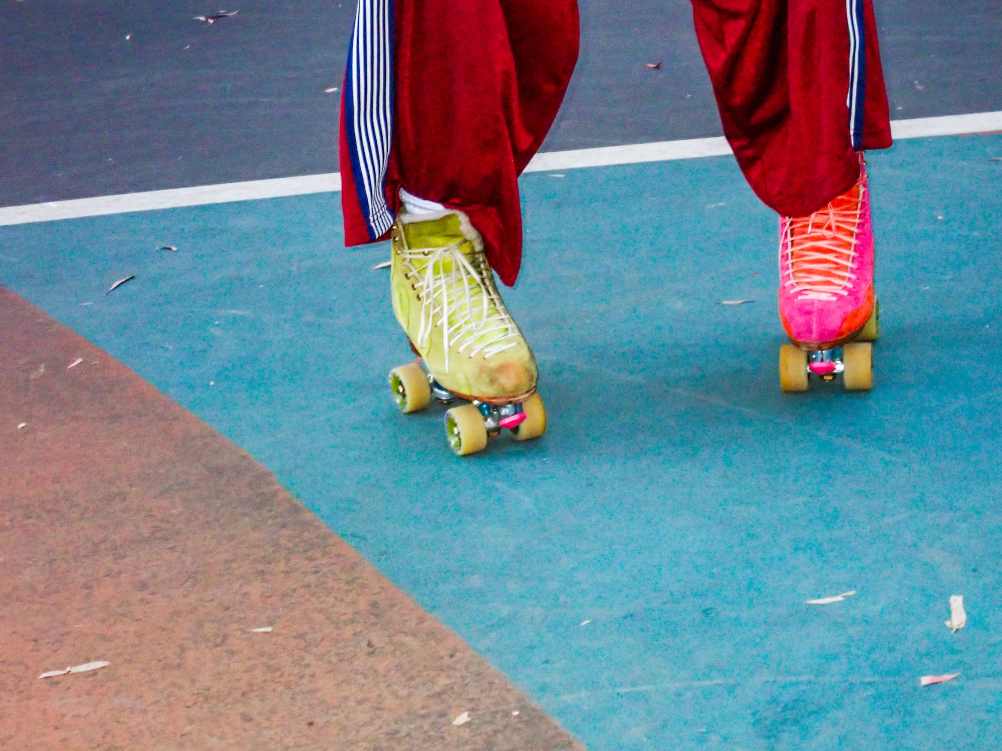 (L) Skaters compete in a partnered clown race. (R) Members bring juggling balls, toys, and their skates. (Camille Cohen for COYOTE Media Collective)