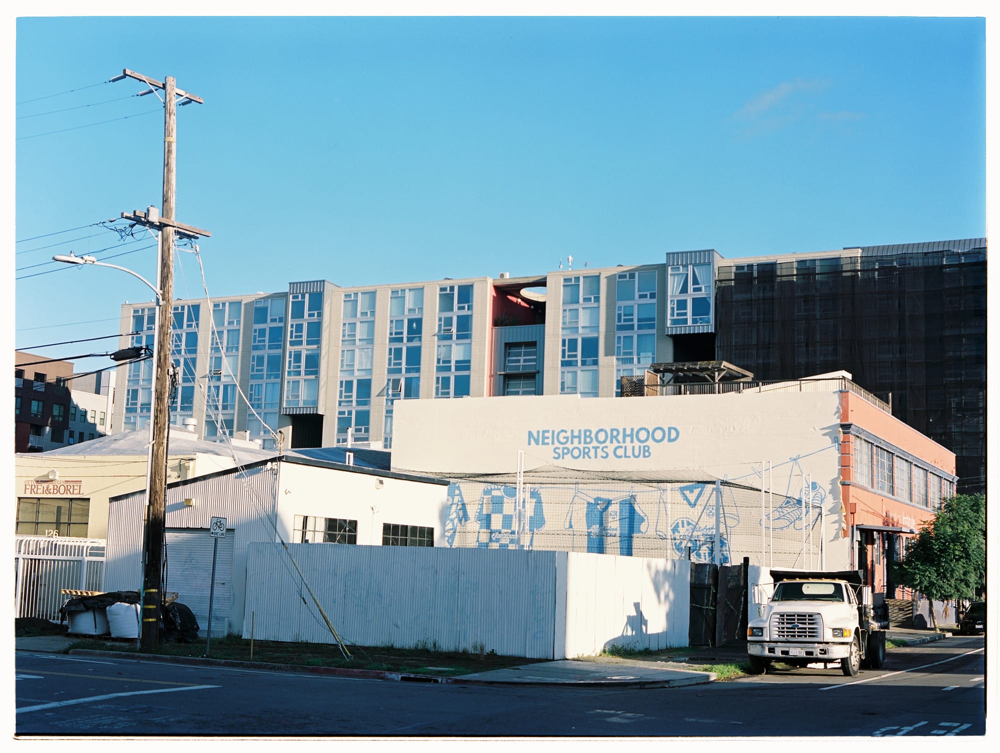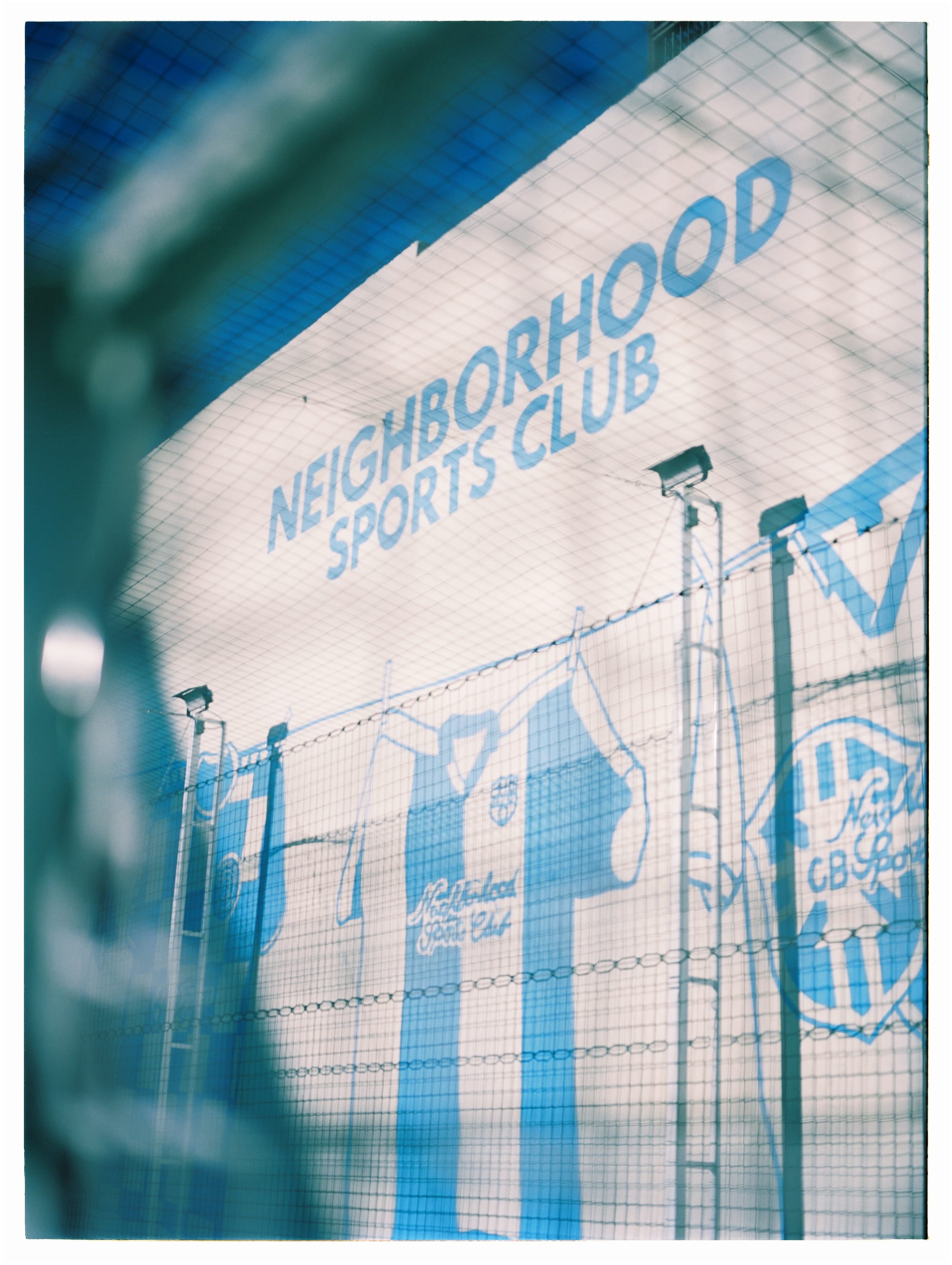 On a chilly Wednesday night in Oakland’s Jack London Square, a group gathers at a field on the corner of Second and Oak streets. The gated pitch is framed by a mural that reads: Neighborhood Sports Club (NSC). Stretched across two walls, seven larger-than-life jerseys and a pair of cleats are depicted. The vibrant kits — which include Marseille, Arsenal, and the France national team — are stylishly outlined in NSC’s signature baby blue, and honor the fandoms and family histories of each of the group’s three co-founders.