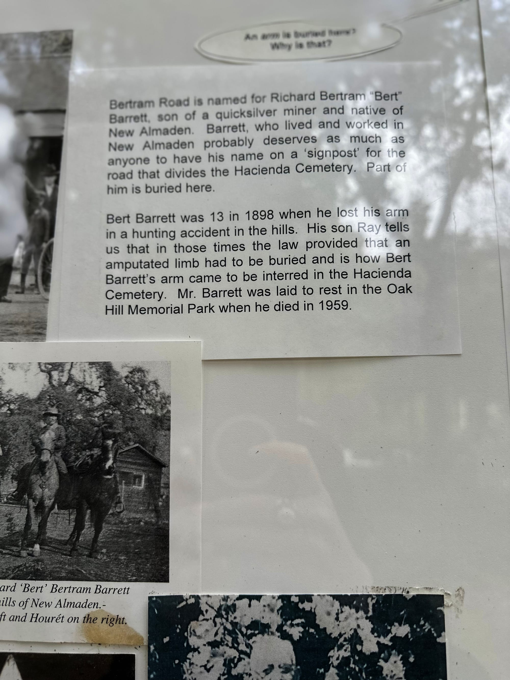 According to local historian and Vice President of the California Pioneers of Santa Clara County Bill Foley, the date on the marker is wrong: It was in 1897 when a teenaged Bert went riding out to go hunting and fell off a fence he was seated on while holding a shotgun. The gun went off, sending a blast through his left arm at the mid-humerus and mangling it beyond repair. He lost the arm, but he lived. Though some sources will state his arm was buried in compliance with the law, Foley states the burial was more in accordance with the spiritual notion that Barrett and his arm would be reunited in the plane beyond. The headstone was added later.
