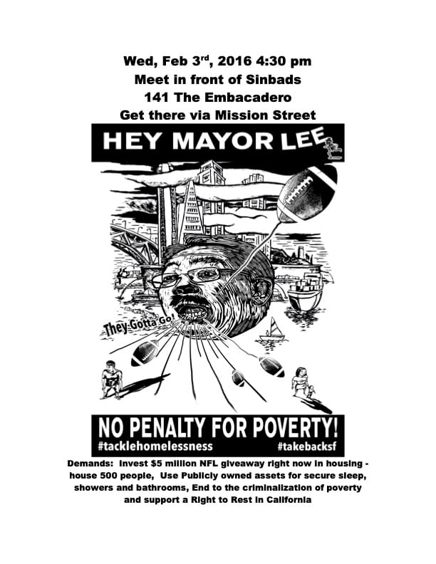 Flyers for the Feb. 3 protest slammed Mayor Ed Lee for sweeping homeless camps. (courtesy Coalition on Homelessness)