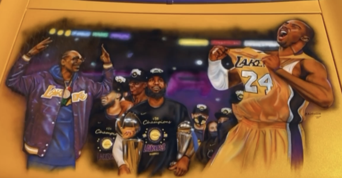 (L) A Haight & Ashbury-themed Volkswagen Beetle airbrushed by Airballin. (R) For Snoop Dogg's 50th birthday, the Long Beach rapper commissioned Airballin to airbrush his 1968 Mercury Cougar with a mural of himself, LeBron James, and Kobe Bryant. (Courtesy of Deandre Drake)
