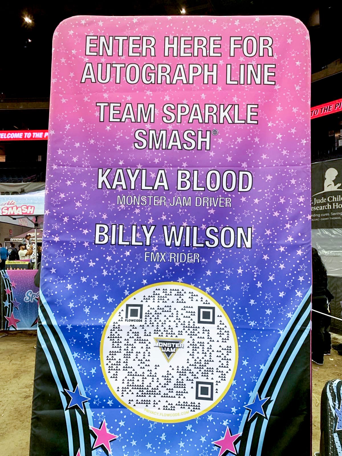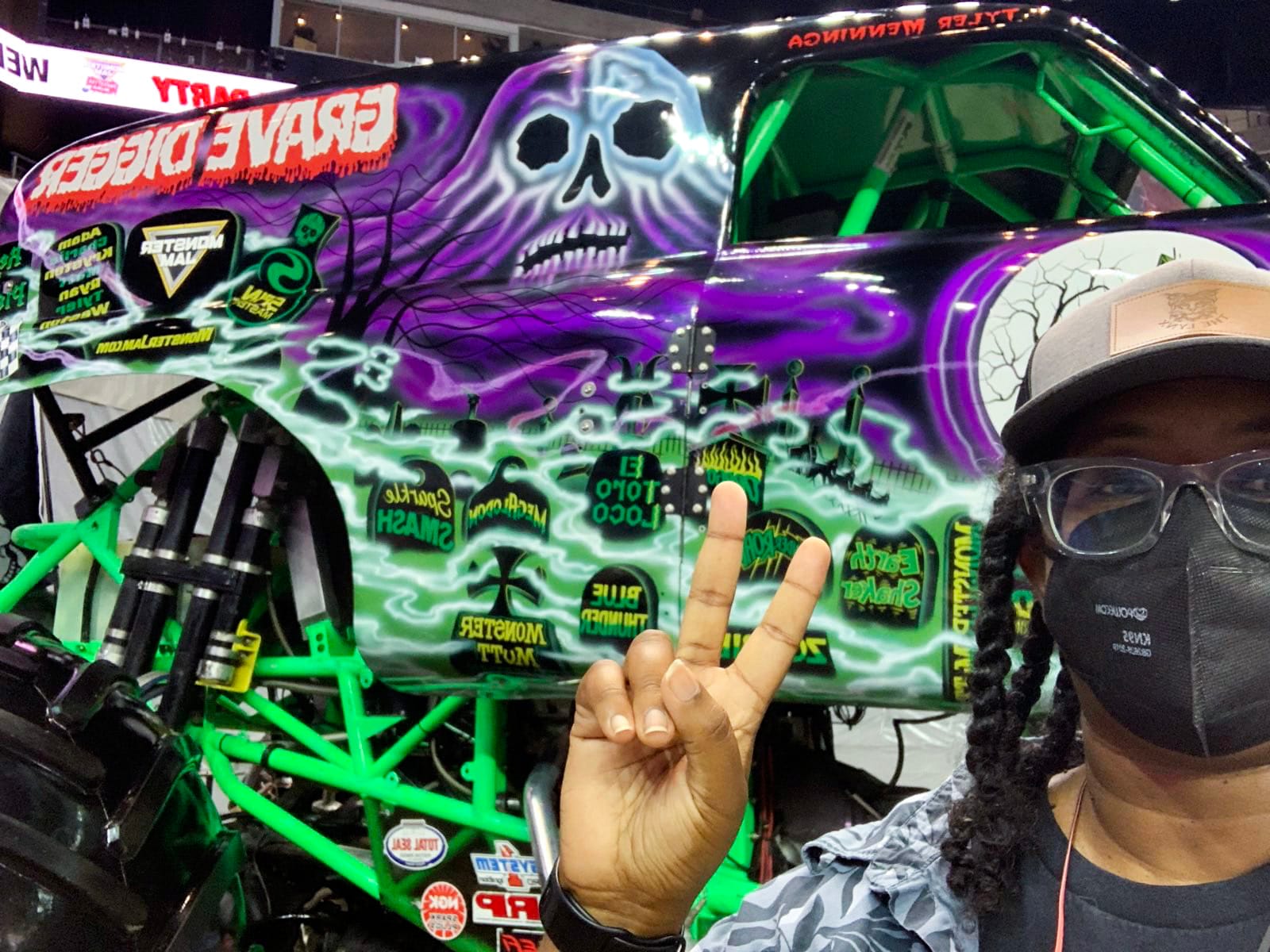 (L) Rahawa standing in front of the Grave Digger monster truck. (R) A sign at the entrance to the Sparkle Smash autograph line. (Rahawa Haile/ COYOTE Media Collective)
