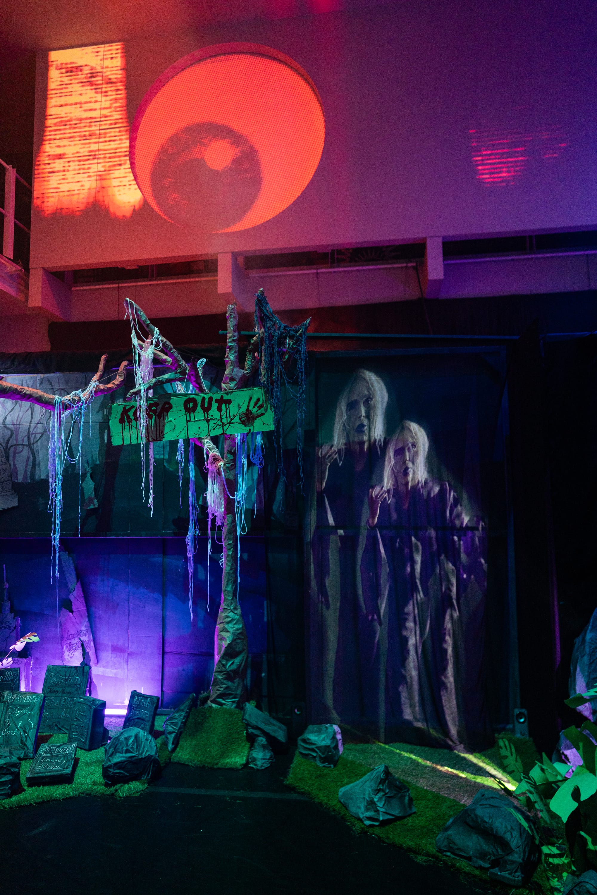 Among the terrors of The Haunt: A spinning wire chandelier and witches under a menacing eyeball. (Robbie Sweeny/YBCA)