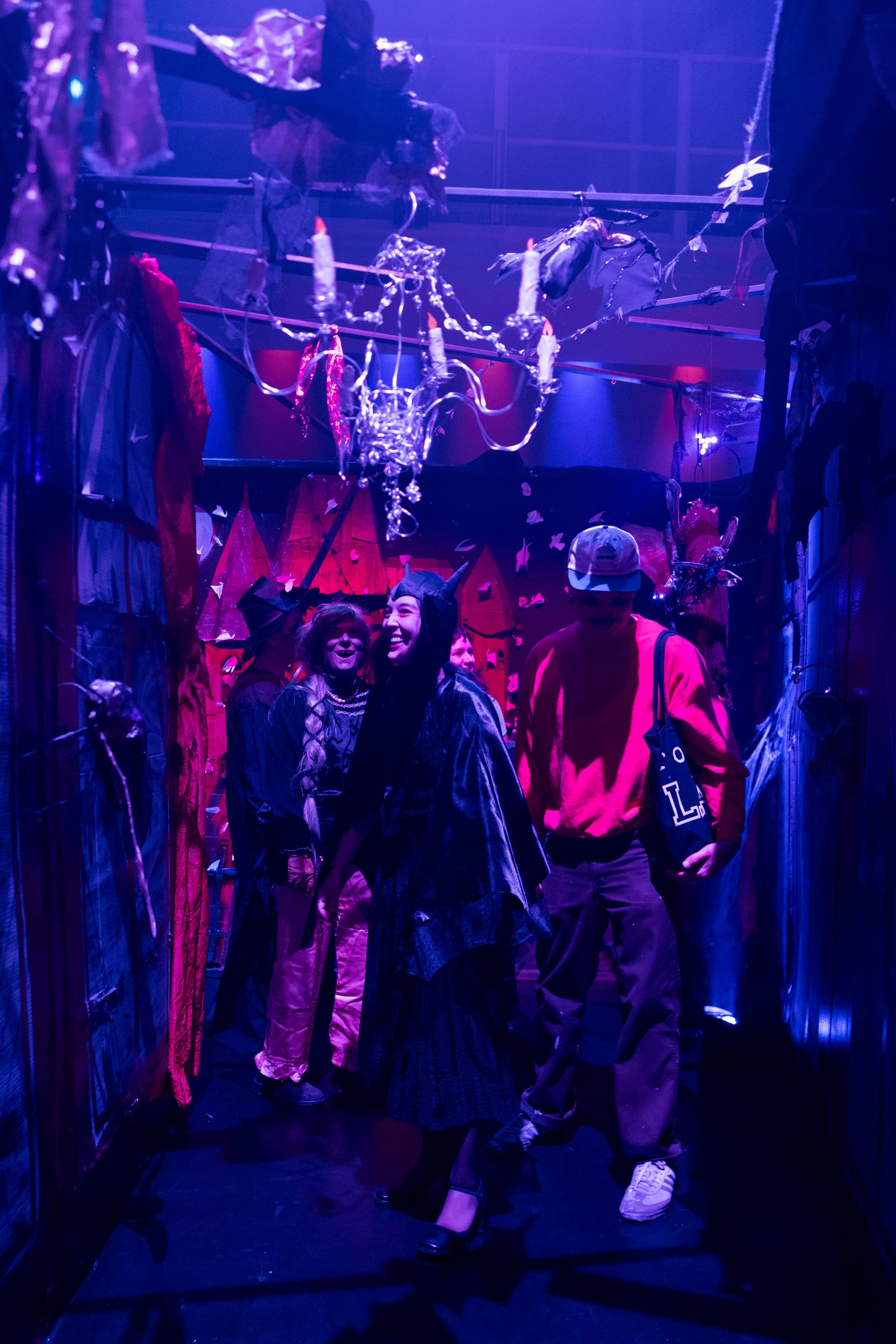 The project is led by Bat Witch Ghost, a new organization devoted to celebrating the populist, artistic aspect of the American haunted house. Over the course of several months, founders Aaron Wojack and Anna Sapozhnikova wrangled a team of local artists to build each section of the experience with mostly recycled and discarded materials. Every scene is handmade mostly from garbage (complimentary), such as the cardboard candles on the wire chandelier and the spray-painted plastic walls of the maze itself. A standout section by artists Alexis Reiko Yonan and Oliver Hawk Holden is a gruesome video retelling of an old Japanese folk story about the “yuki-onna,” a female snow spirit, with someone’s very good and fluffy dog standing in as a ferocious wolf.