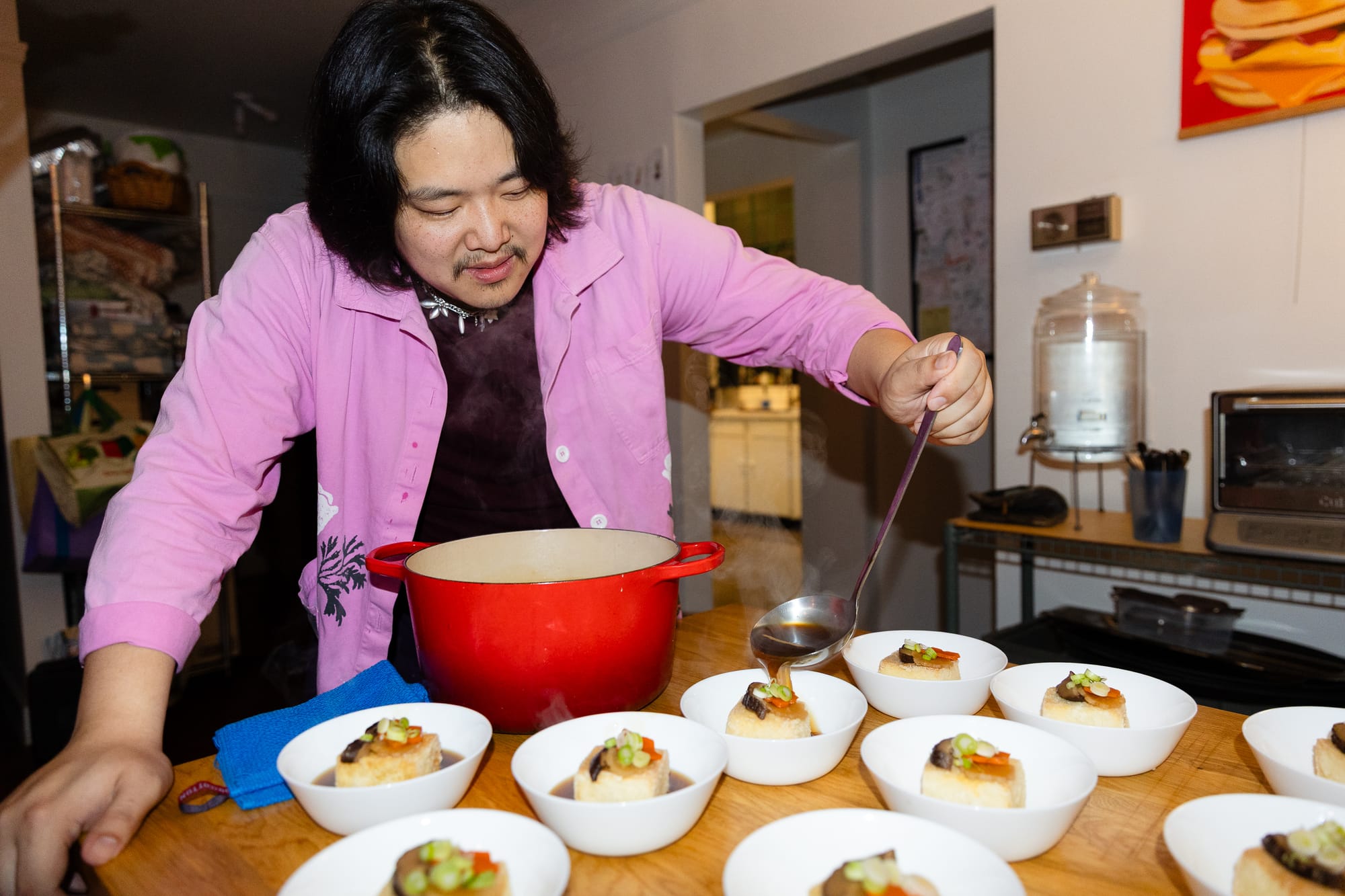 Sean Ang, chef and founder, makes soup with fried tofu, vegetable dashi. (Estefany Gonzalez/COYOTE Media Collective)